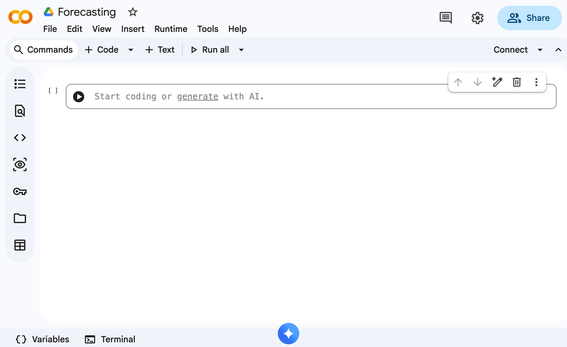 Open Google Colab in a new tab or by clicking here. Then create "New Notebook" to get started (make sure you are signed in).