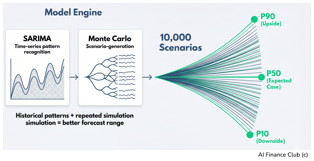 He built a Python-based forecasting pipeline using a SARIMA model and Monte Carlo simulations (machine learning algorithms I’ll explain later) that re-forecast in seconds.