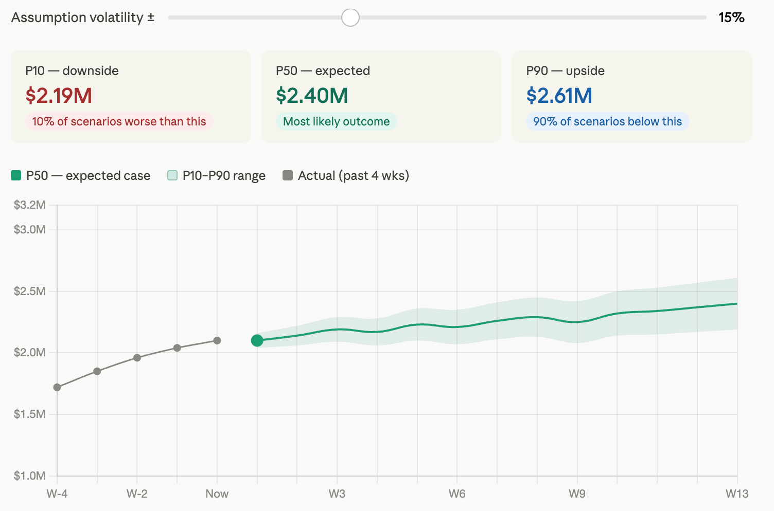 So instead of telling the board "we'll have $2.1M in cash," you say "somewhere between $1.6M and $2.5M, most likely around $2.1M."